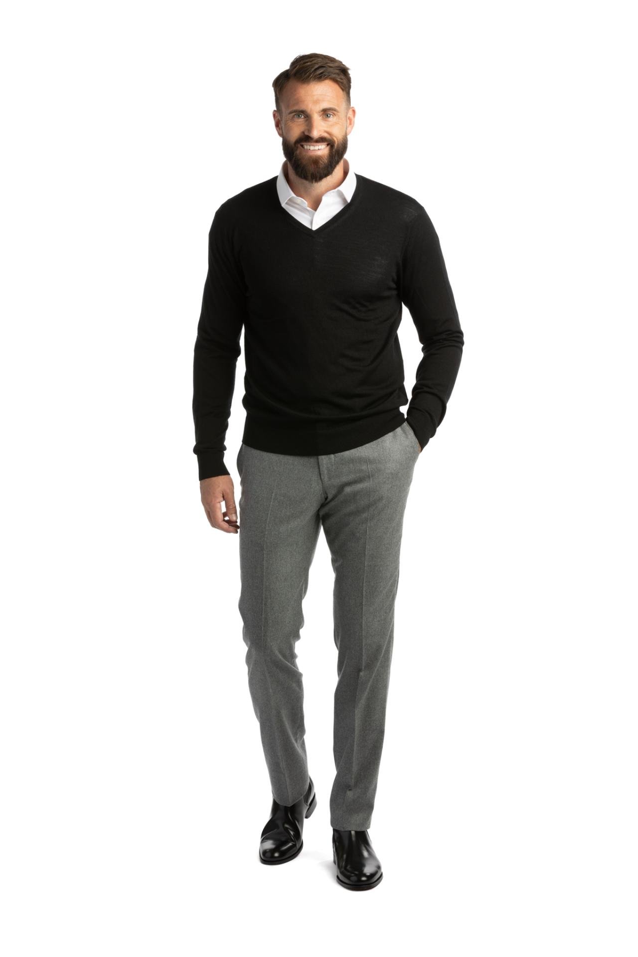 Výstřih do V zajišťuje univerzální využití jak přes košili s kravatou pro formální look, tak klasické tričko. Vyberte k němu klasické chinos kalhoty, oblíbené boty a vyrazte na podzimní procházku.