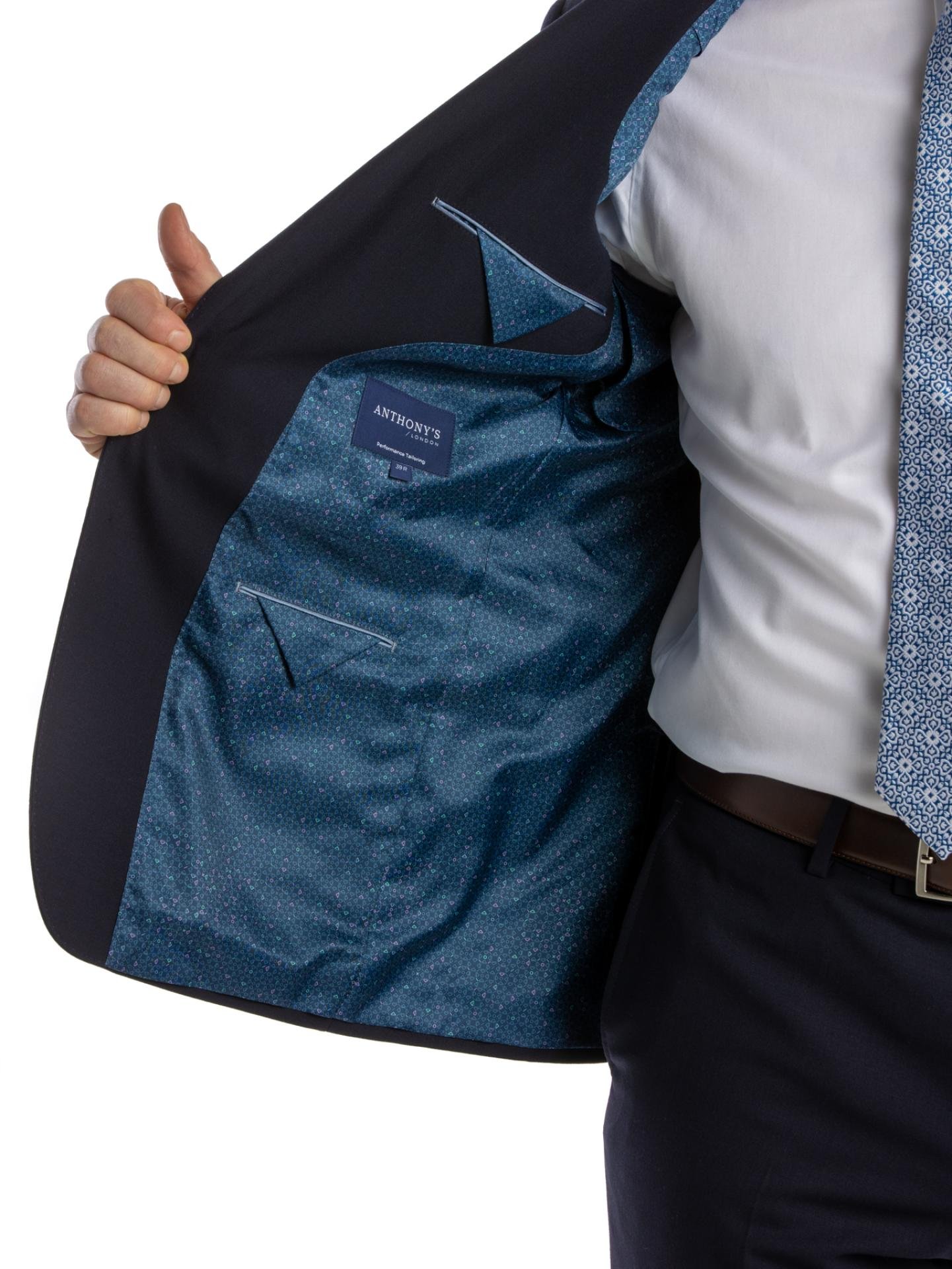 Podšívka s geometrickým vzorem na předních dílech saka dodá unikátní a sofistikovaný vzhled obzvlášť, když je rozepnuté.